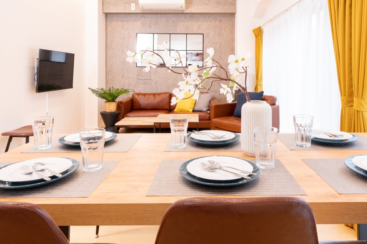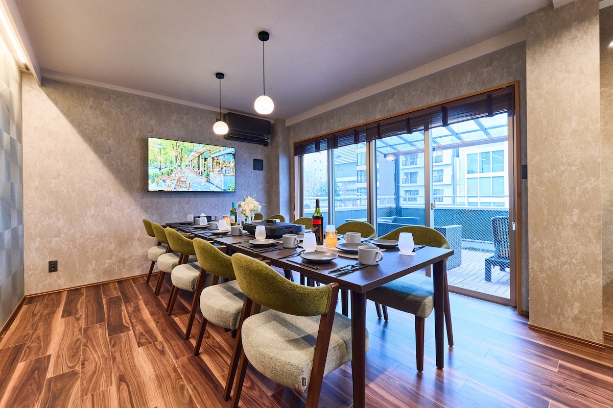 Enjoy a spacious Japanese-modern room with a cozy beds, tatami area, large dining table, kitchen. The room has 2 washbasins, 2 private showers, and 2 toilets, offering great comfort for groups. Located right in front of Tokyo Skytree, just 2 minutes to Solamachi and walking distance to Asakusa, it’s the ideal base for sightseeing. The area has supermarkets, convenience stores, and many restaurants. We have 9 identical rooms available. Experience your best Tokyo stay with us!