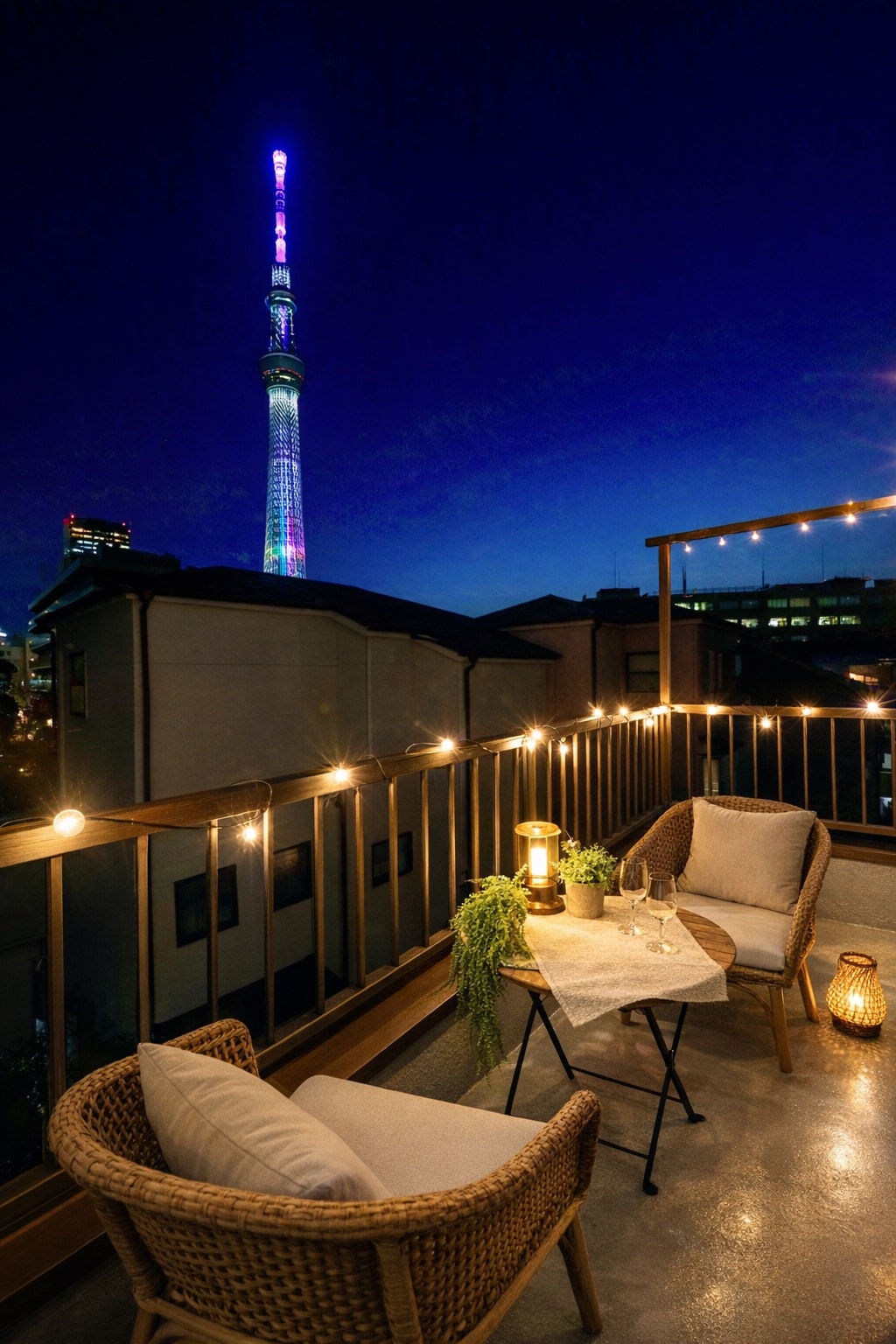 HeySky Oshiage A clean, private hotel renovated in 2024. Designed so guests can enjoy a Tokyo stay that feels like home. From the rooftop balcony, enjoy Skytree views, especially at night. Rent the 100 m² house with kitchen, four bedrooms(Thomas-Symonds mattresses), and two bathrooms. Children’s chairs and toys available, ideal for families. [Important] ・Entrance on the second floor; stairs from the street(see photos). ・Coin laundry on the first floor; some noise or vibration may occur.