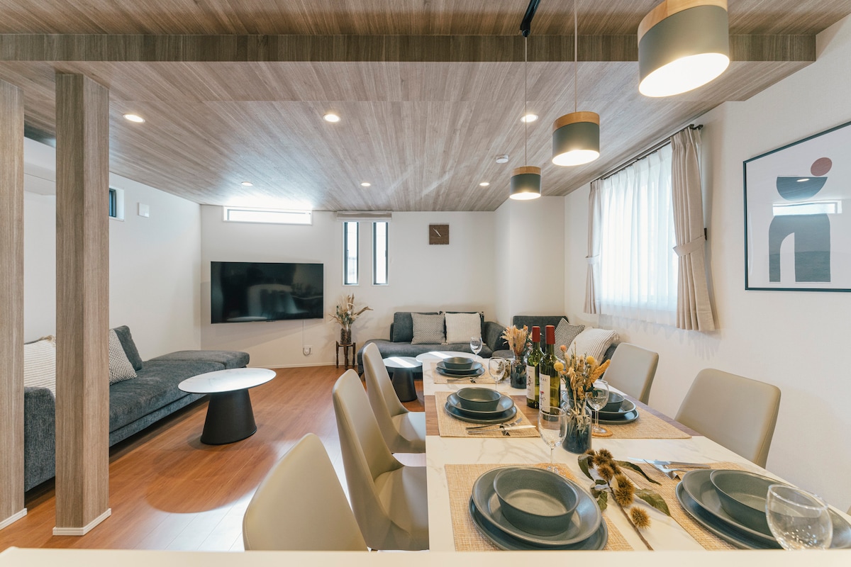 A private house located in a quiet residential area near Tokyo Skytree. Just a short walk from Oshiage Station, with direct train access to Asakusa, Ueno, Shinjuku, Shibuya, and Ginza—plus both Haneda and Narita airports. The interior blends warm wood textures with modern concrete design. Fully equipped with a kitchen, washer/dryer, and free parking. Perfect for families, couples, or groups visiting Tokyo.