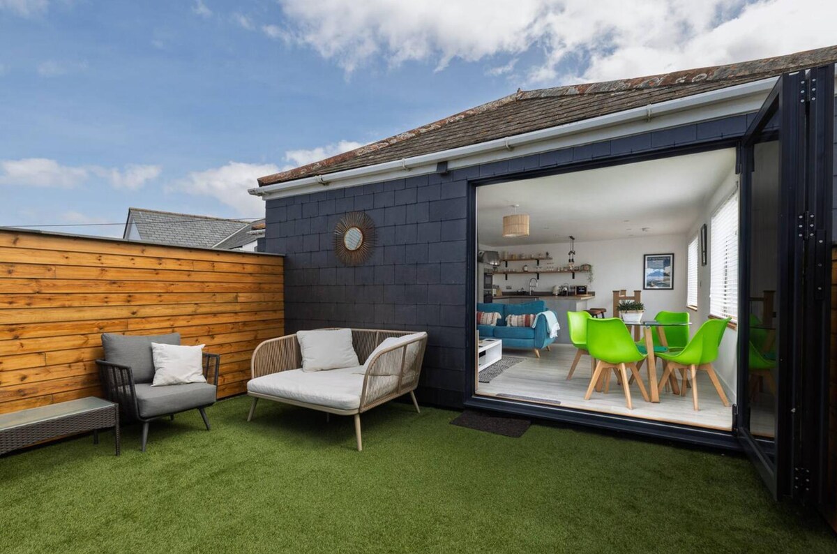 Beach house situated behind the dunes of Mawgan Porth. One bedroom with a king-size bed and a large day bed in the entrance room. Would suit small family, couple or a small group of friends for a surf/walking trip. Stunning views from the upstairs open-plan living and kitchen area with balcony for alfresco dining. Ground level has a lovely decking area with an outdoor shower (cold water), a fridge for chilled outdoor drinks and a hammock for guest use. Perfect for surfing and beach activities.