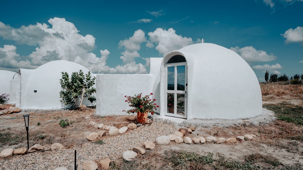 Eco domo fabricado en material reciclado, forma geodésica, con secciones en cristal que permiten disfrutar del paisaje cultural cafetero y techo en vidrio para ver las estrellas desde la comodidad de tu cama. Igualmente, puedes relajarte en un jacuzzy privado con 120 chorros de hidromasaje, junto a tu pareja y disfrutar del calor de una fogata en medio de la naturaleza.