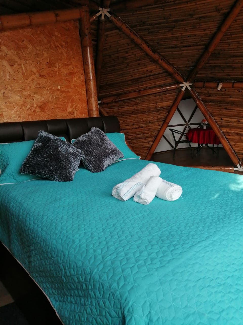 Cabaña con forma de Domo, tiene vidrio para ver las estrellas desde tu cama. Con vista al Nevado del Ruiz, está dotada de minibar, chimenea de combustión lenta y un jacuzzi interno que te permitirá un baño romántico, sin importar las condiciones climáticas del exterior, ideal para celebraciones de aniversario y cumpleaños.