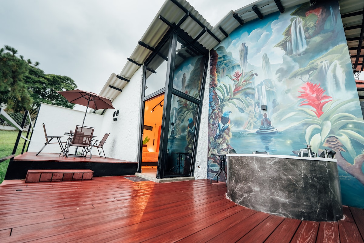 Un hospedaje con la receta perfecta: la comodidad de un alojamiento nuevo y moderno,la belleza del eje cafetero,el aire limpio,la noche estrellada,esta es una experiencia llena de tranquilidad que le recargara de energía mientras disfrutas del jacuzzi con una copa de vino y las luces de la cuidad a sus pies .Todo dentro de un marco de privacidad y excelente atención.