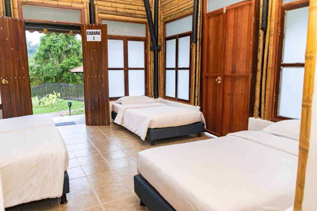 Habitación Familiar en Hotel Típico del Eje Cafetero a 2.5 Km de Termales de Santa Rosa. El hotel cuenta con amplia zona social, animales de granja, avistamiento de aves, senderos ecológicos en la ribera del rio, asador.
