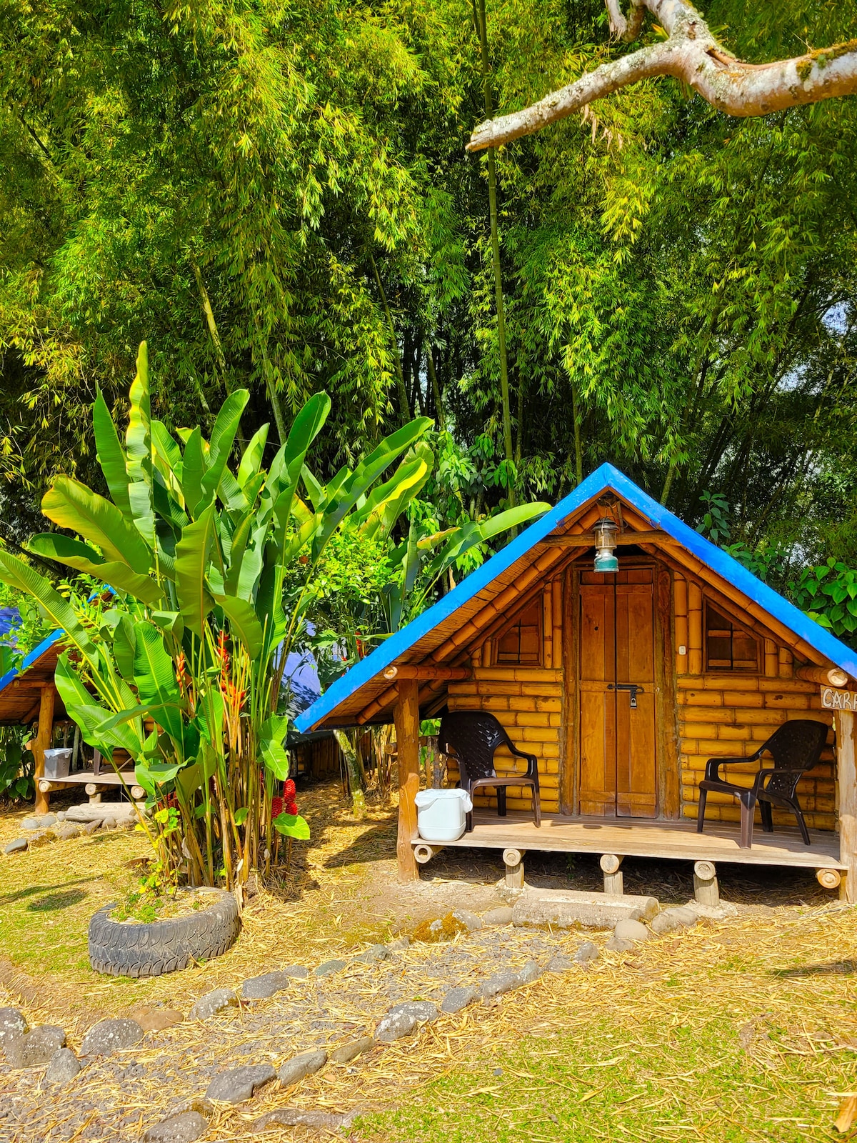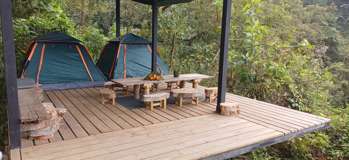 Glamping en medio de los bosques de Boquía en Salento Quindío. Ambiente de flora y fauna silvestre. Un glamping en construcción rustica con materiales de la región como la guadua y maderas y en combinación con acabados modernos. Frutas, café, cereales y yogurt gratis durante la estadía. Cerca a ríos, cascadas y rutas para avistamiento de aves. Dotación completa de cocina y equipo para avistamientos de flora y fauna. wifi, agua caliente, parqueadero. Ambiente totalmente privado e independiente.