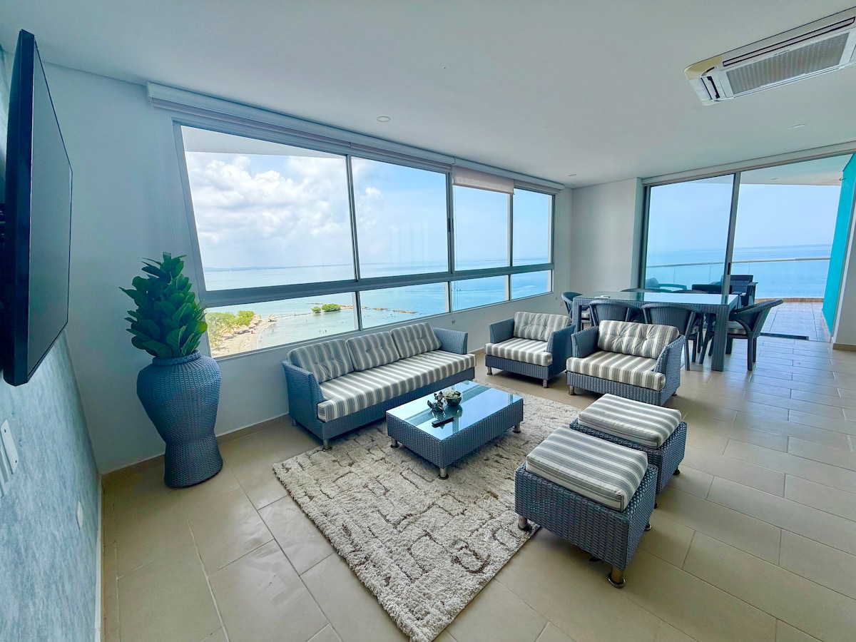 Es un apartamento con excelente vista al mar, ambiente familiar El edificio cuenta con piscina y jacuzzi Es un edificio residencial con servicio de portería y vigilancia durante las 24 horas. Cuenta con un ascensor y parqueadero. A 2 kms del edificio encontrara supermercados como El Oriente, Olímpica, D1 y Ara. El costo incluye una persona que presta apoyo de aseo, y cocina con un horario de 8am a 4pm. Capacidad máxima de Huéspedes 8 personas ( incluyendo niños)