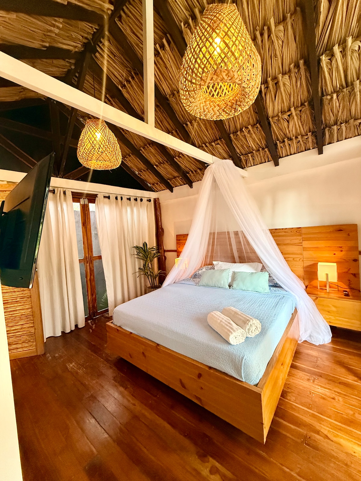 Immerse yourself in the tranquility of our cozy loft-style apartment by the sea, Coralina Lodge, located at El Francés Beach. Enjoy the warm Caribbean Sea and an environment surrounded by lush mangroves. Ideal for couples, small families, or those seeking a solo experience. It features a terrace with a sea view and a balcony overlooking a lagoon, in an ecotourism complex committed to sustainability and solar energy, which includes pools, a jacuzzi area, restaurant, and bar.