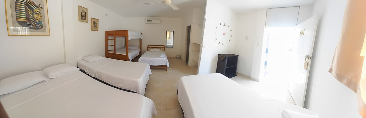 Habitaciones privadas para 1 o 4 personas, incluye cama doble, camarote, baño privado, aire acondicionado y TV. A sólo una cuadra del mar, frente al edificio Arrecifes Coveñas. Sí, es en Coveñas (primera ensenada). Cercano al mar y todo lo que necesitas para un buen descanso, contamos con servicio de restaurante ☀️