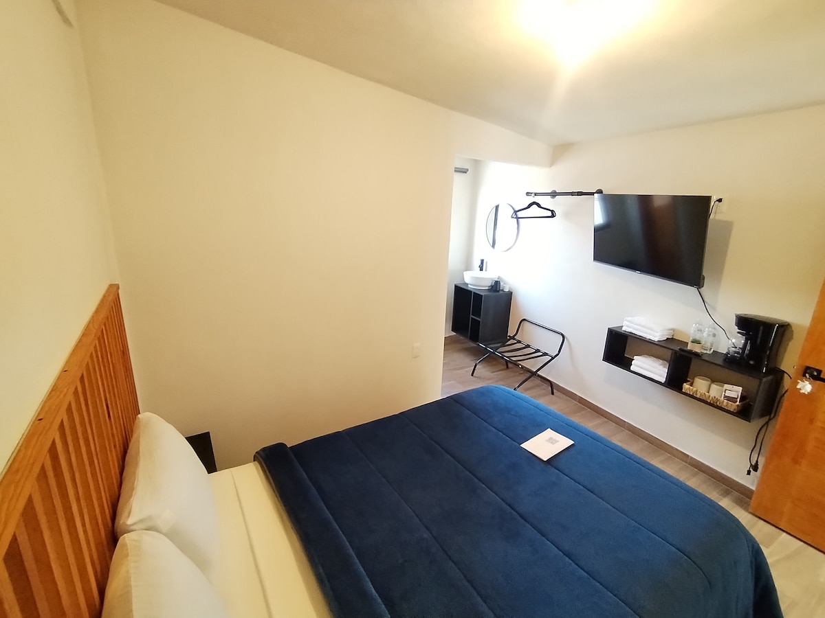 En Hoja Santa Hospedaje contamos con esta habitación moderna y comoda con cama matrimonial, TV y excelente iluminación. 🚿 Baño completo privado con regadera. ☕ Incluye cafetera, toallas y un ambiente cómodo y tranquilo, ideal para descansar.