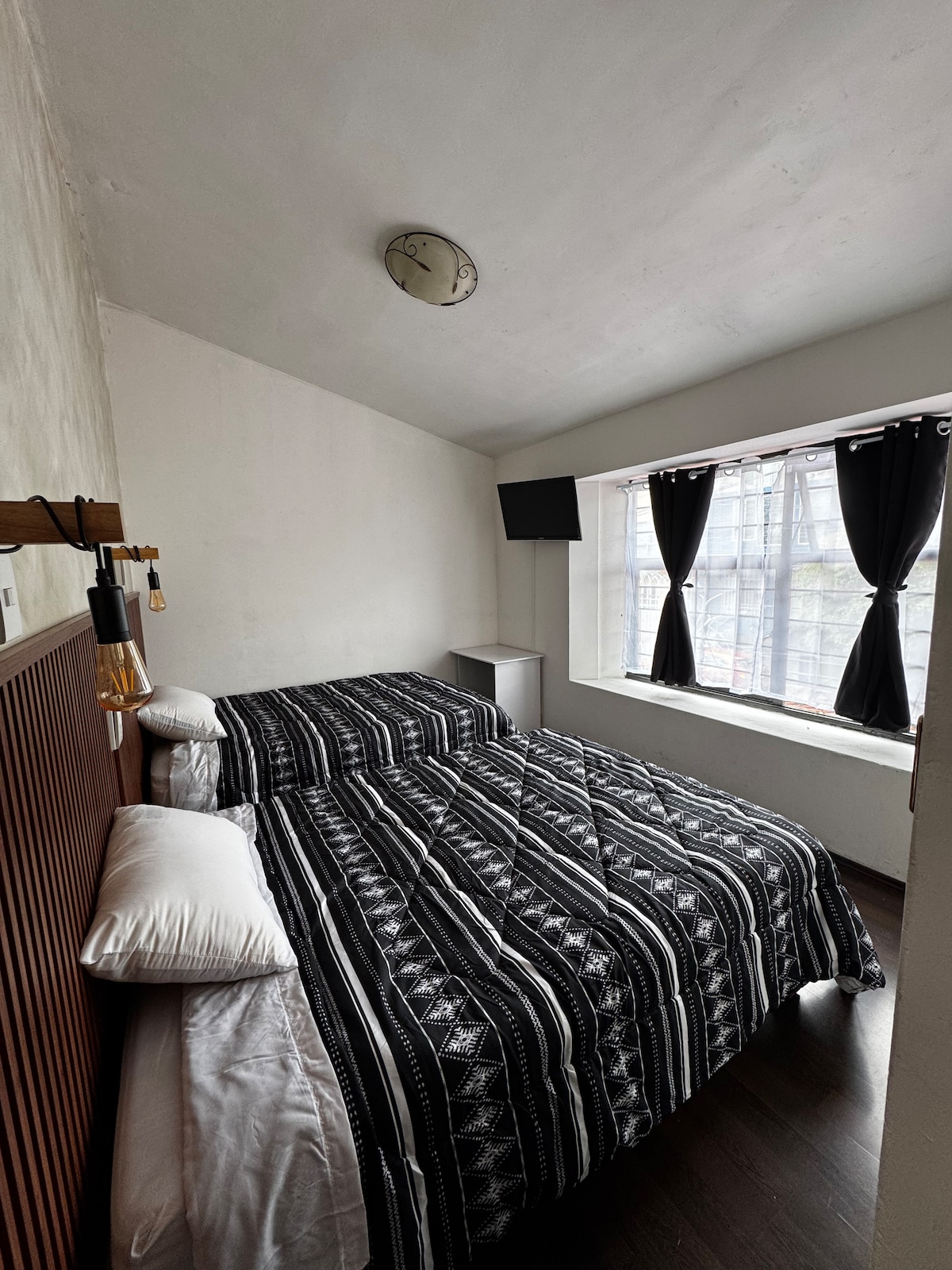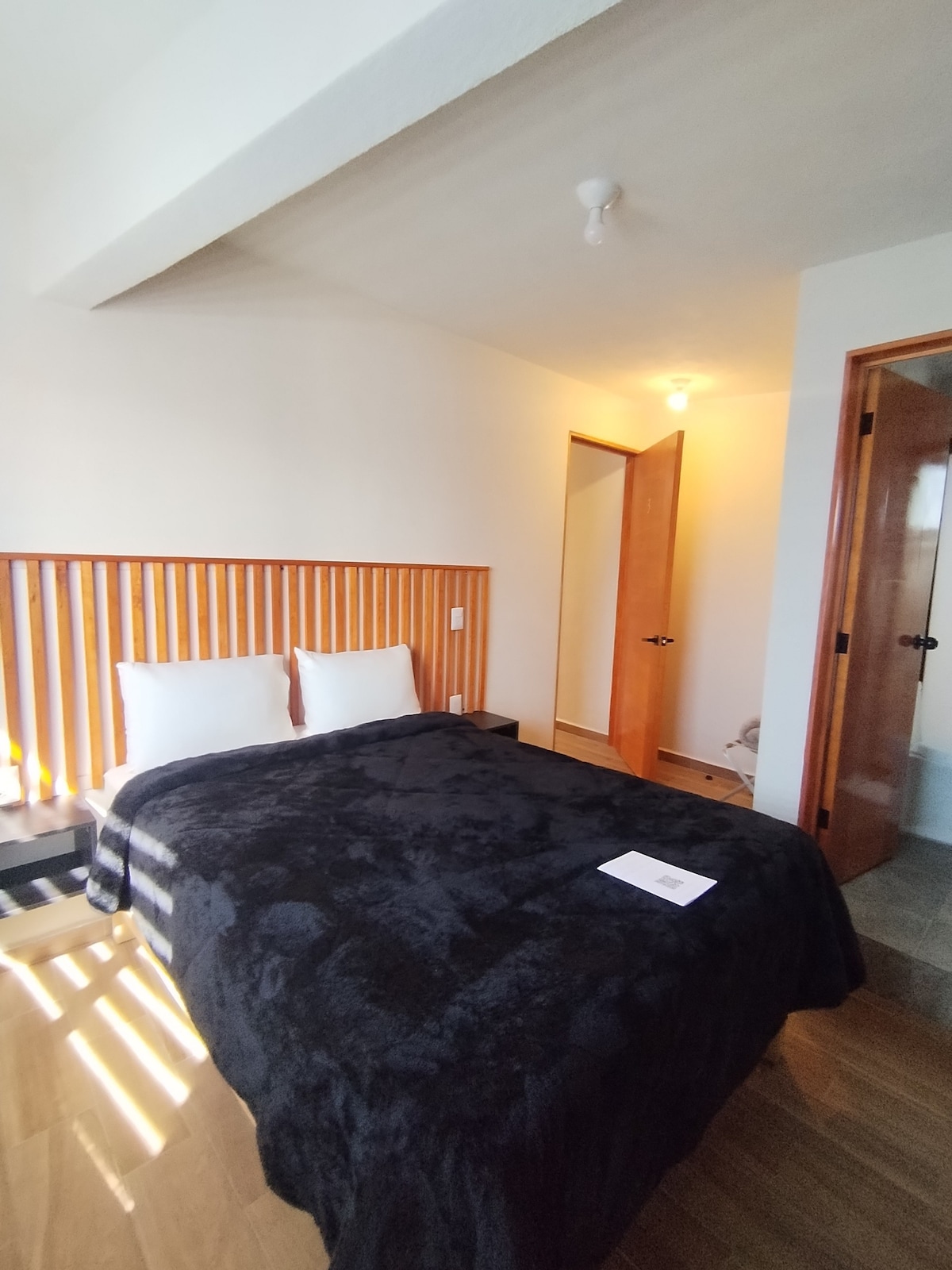 Habitación matrimonial.📍Ubicación estratégica, cerca de bares, cafeterías, restaurantes, tren interurbano y hospitales. Estamos a 40min del nevado de Toluca 🗻.🔥 Área para fogata. Convenio de estacionamiento cercano con tarifa preferencial. Wifi rápido, plataformas de streaming y TV por cable. 🛜 Hospedaje pet friendly con costo extra (razas pequeñas y/o medianas) En las instalaciones encontrarás 4 gatitas amorosas por lo que esperamos que sean tratadas con respeto.🐈⬛