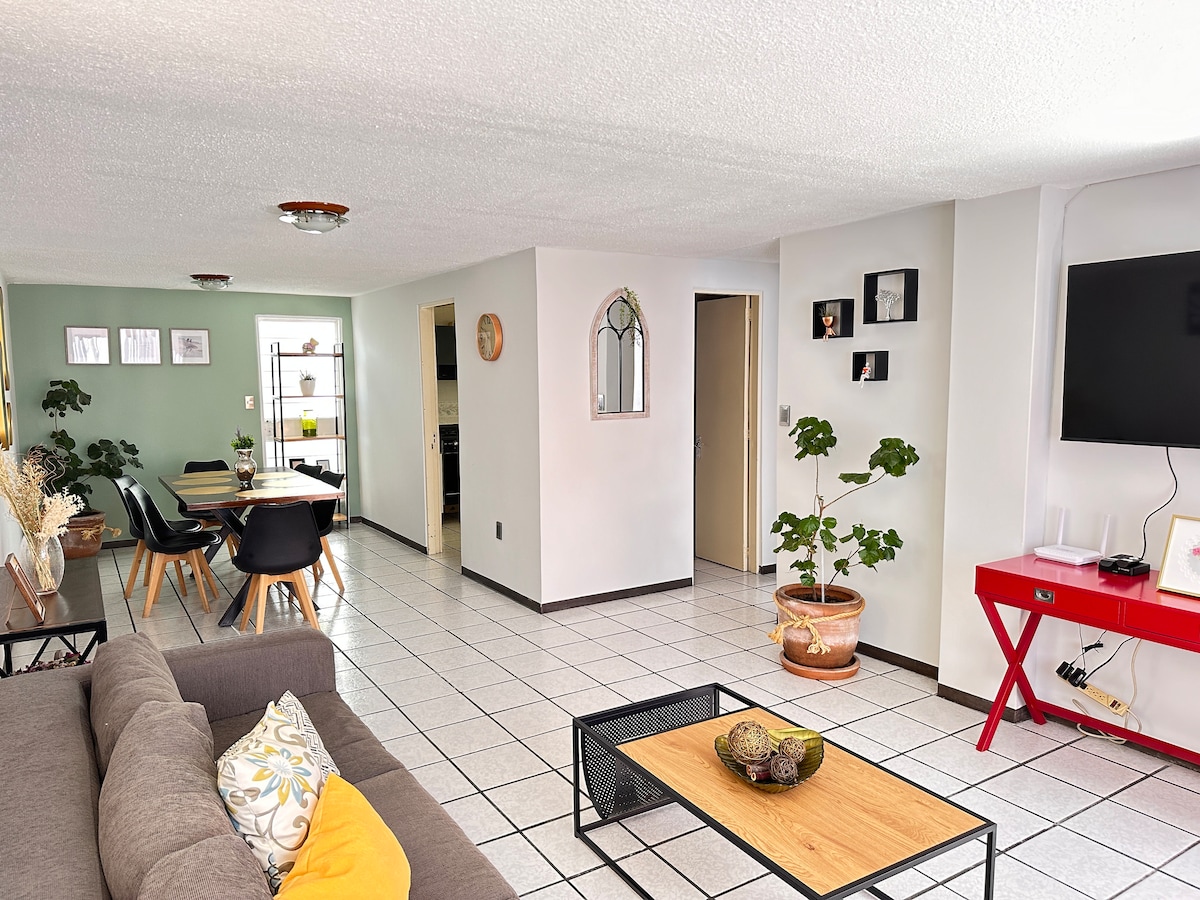 Moderno loft de doble altura, totalmente equipado. Excelente ubicación para viajes de trabajo y negocios; contamos con facturación y ofrecemos descuentos para estancias prolongadas. Servicio de internet 600MB y TV de TotalPlay. Habitación con cama queen en planta alta y estancia con sofá cama, 1.5 baños, minisplit de aire acondicionado. Cocina completamente equipada, lavasecadora, estacionamiento privado y áreas verdes.