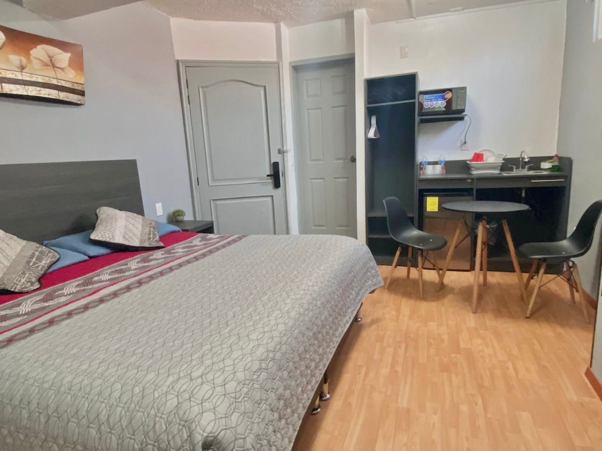 Bonito estudio (mini-depa) con entrada independiente, baño completo, estufa, refrigerador, desayunador, sala con TV y DVD, películas y juegos de mesa. 1 cama matrimonial y sofá-cama. Sin problema de estacionamiento en privada con portón eléctrico. Servicio de transportación, lavandería y limpieza a solicitud (muy económico) Inmejorable vista de Toluca.