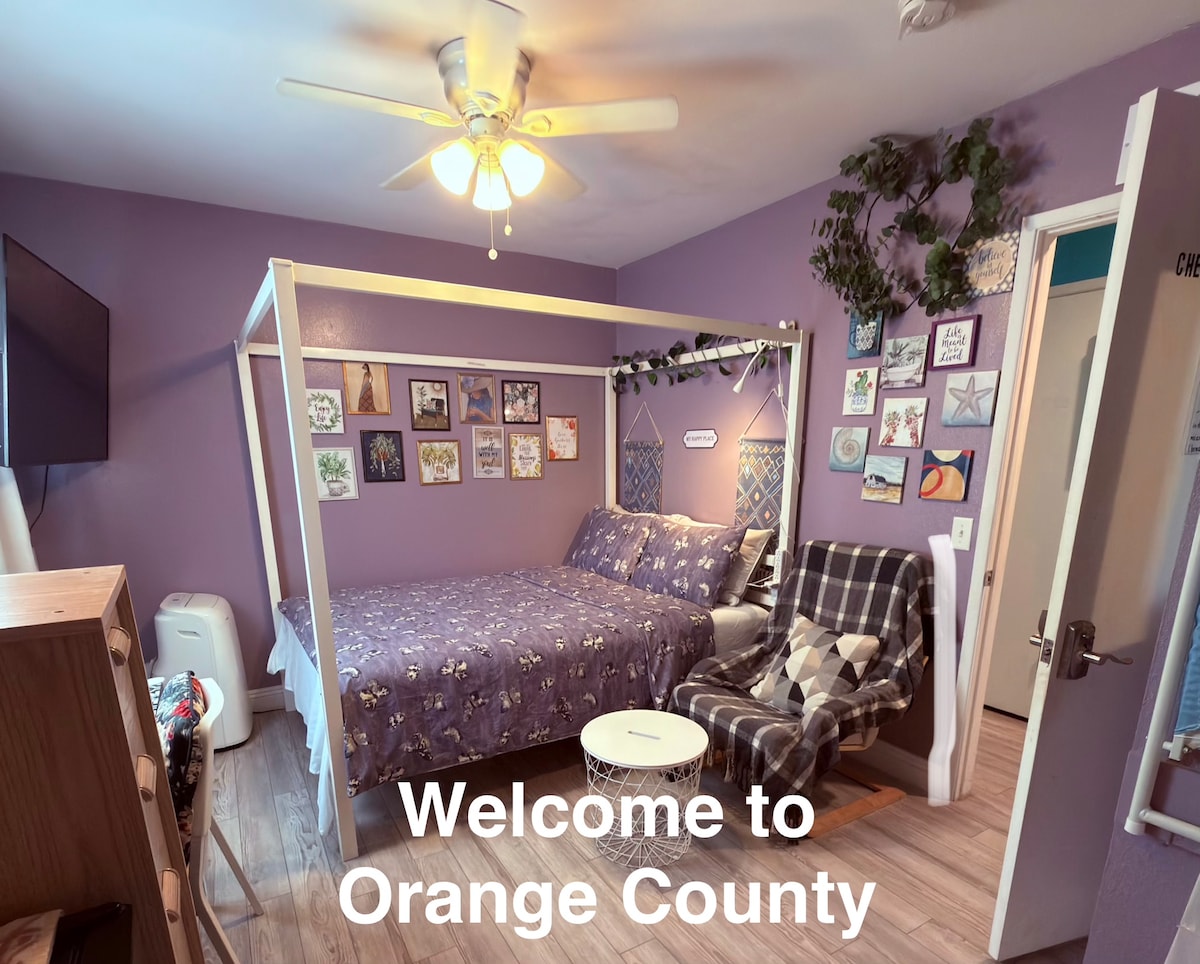 Lovely private 1 Queen bedroom , sofa bed and 1 living room Studio with Private Entrance and patio. This location is perfect for guests looking to attend the amusement parks. - 7’ to Disneyland and Anaheim Convention Center - 8’ to Knott’s Berry Farm - 15’ to John Wayne Airport - 25’ to Huntington Beach - 40’ to Universal Studio and easy access to all other attractions in Orange county. Parking on the driveway. Self check in . Free wifi. Furnished with 1 queen bed, sofa bed. Max 3 persons.