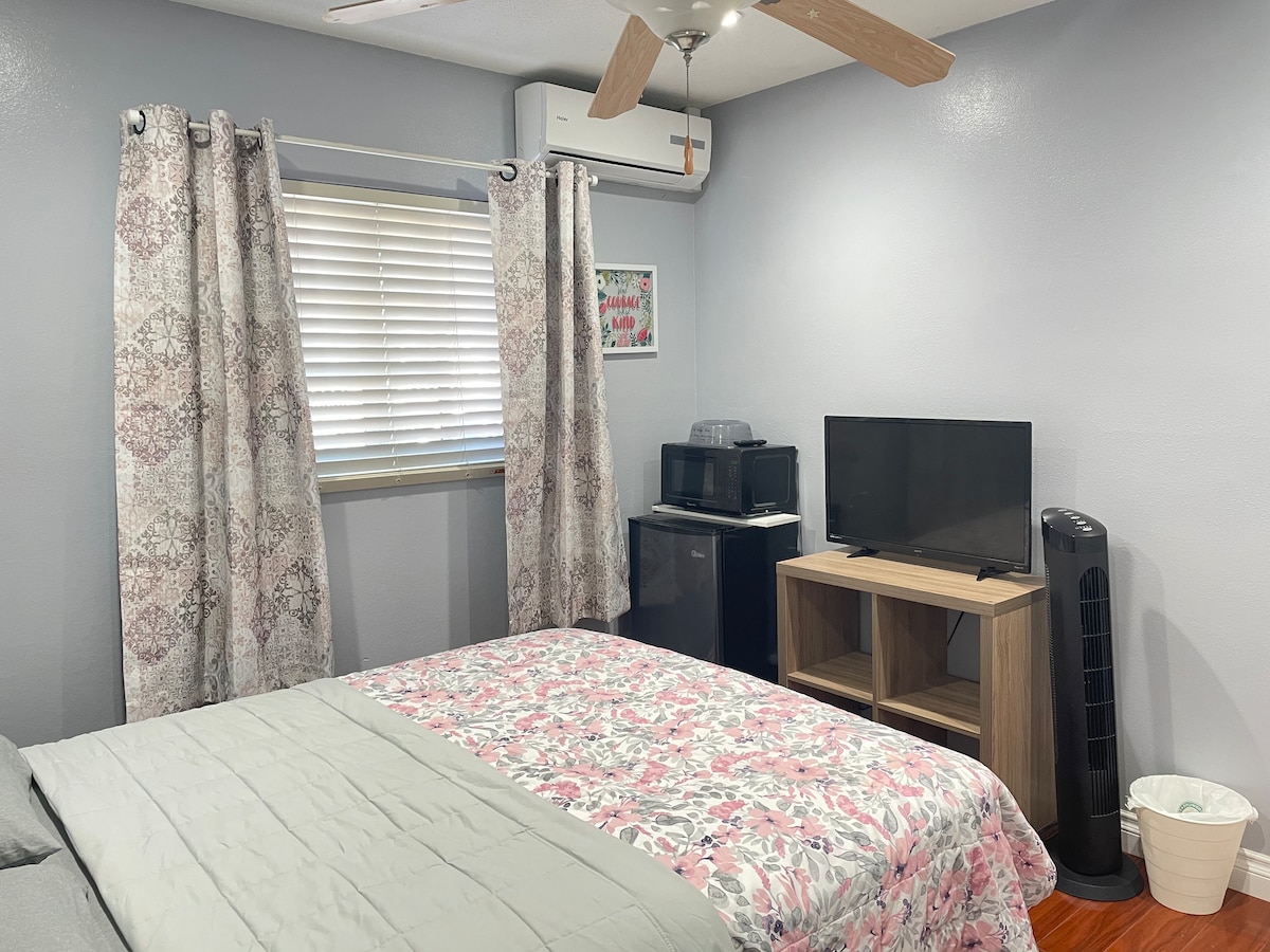 Spacious master bedroom, detached from the house, access from street, off-street parking. Furnished with 1 queen bed, a sofa bed, a dinning table set, mini fridge, microwave and electric kettle; AC and TV with Netflix Max 2 adults and 1 child. Free laundry onsite. Located in Anaheim, 2.5 miles from Disneyland and Anaheim Convention Center, 4 miles to Knott's Berry Farm, 10 miles to Huntington Beach. Grocery, dinning, gas station nearby Forget your worries in this spacious and serene space.