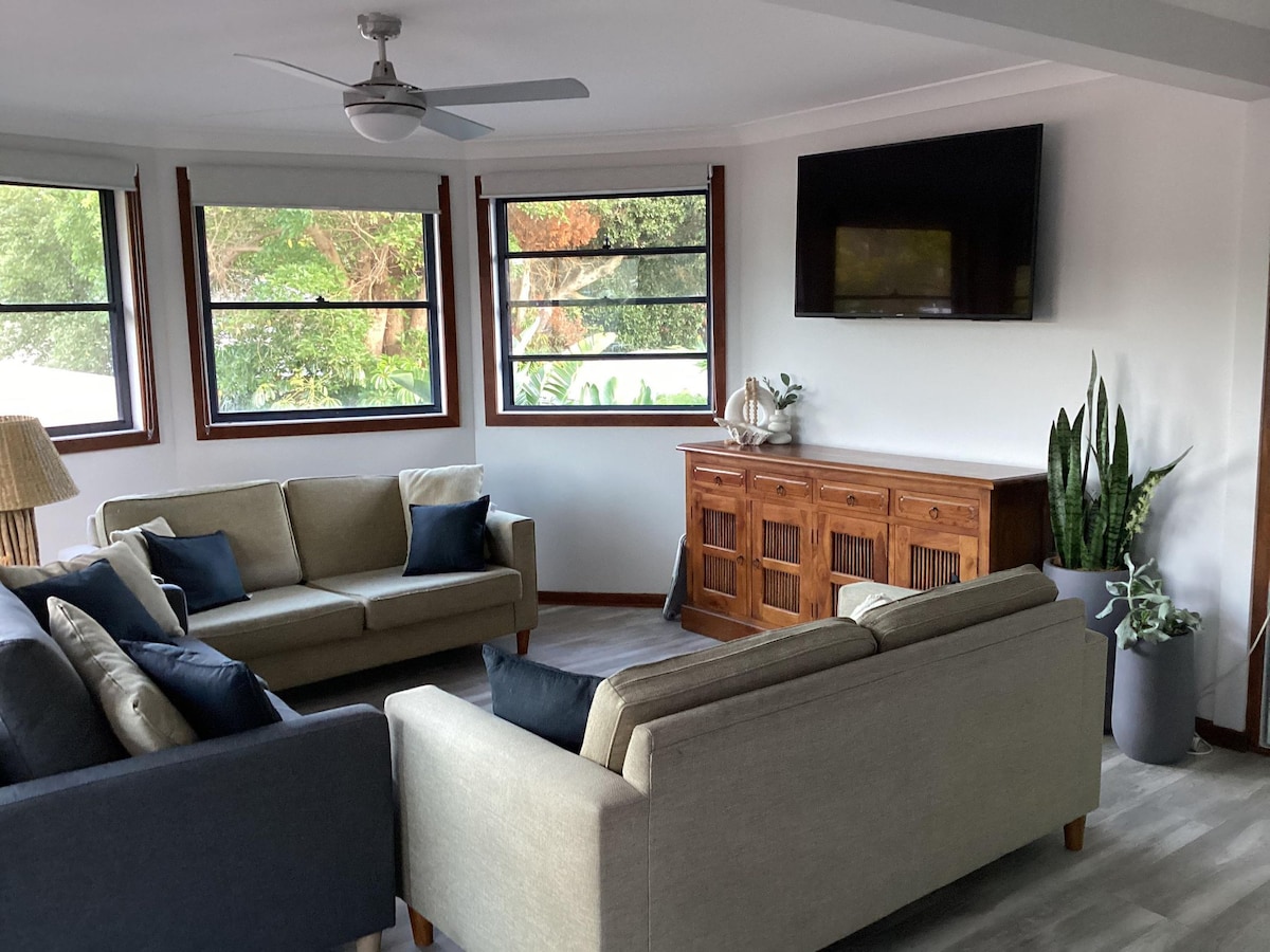 This unique place has a style of its own. Modern beach industrial, styled with love. Perfect for couples, families and friends offering one of the best amenities in Fingal Bay. Not only relaxing and peaceful but perfect for a few days away ...and then you will want to rebook for longer! This property is unique for its modern style, relaxed atmosphere and privileged views. Just try and buy -it won't let you down. Please note, the listing is the bottom level of the house only.