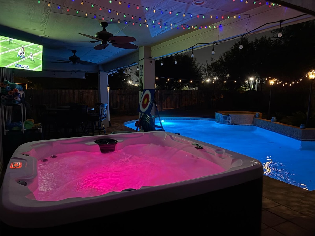 Charming Poolside Retreat Minutes from The Woodlands Mall Escape to your serene oasis, just ten minutes from The Woodlands Mall. Our villa features a spa for 8 adults, a cozy living room with a fireplace and egg chairs, and a private pool with optional heating. Enjoy arcade machines, skeeball, and three large TVs. Nearby attractions: The Woodlands Waterway for a romantic stroll, golf course, The Woodlands Shopping Center, tranquil forest walks, concerts, and Lake Conroe for an adventure.
