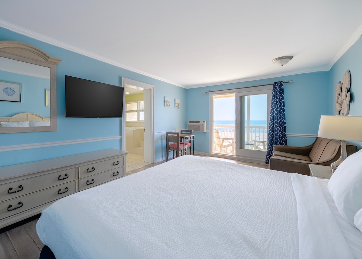 Unwind in an Oceanspray King with Balcony featuring a jetted tub, private balcony, and partial ocean views. Rooms include a microwave, coffee maker, and mini refrigerator. Enjoy 2 seasonal beach badges (6/15–9/7), beach chairs, towels, high-speed Wi-Fi, and daily fresh-brewed coffee and filtered water in the lobby. Rooms accessible via both elevator and stairs.