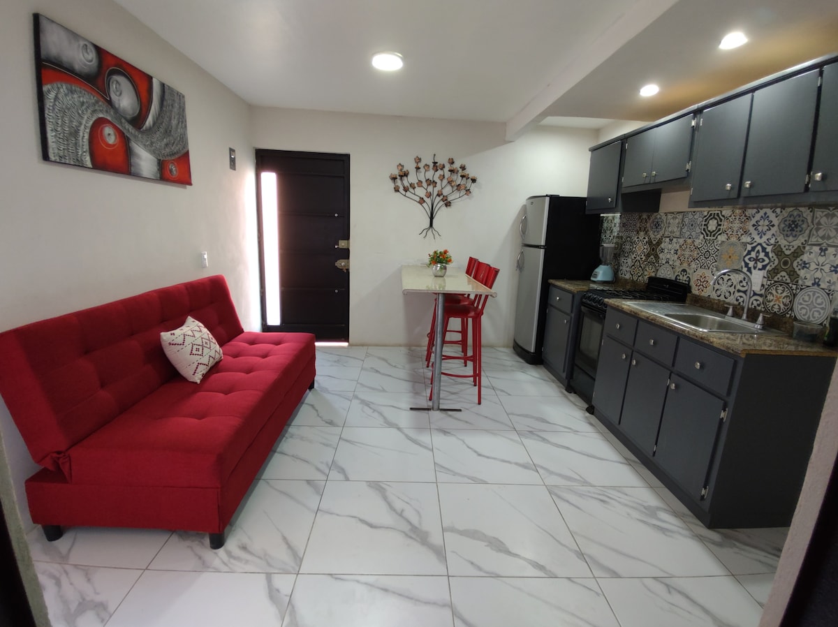 Departamento nuevo y privado en primer piso dentro de una casona remodelada, con cama King, sofá cama, sala, comedor y cocina completa. Ideal para parejas o amigos. Elegimos una hermosa casa cuya arquitectura nos enamoró inmediatamente por sus muros altos de piedra y ladrillo, sus enormes ventanales en una calle tranquila y segura, en la zona más turística, bares, cafecitos, restaurantes trendy. Internet rápido de alta velocidad hasta 350 Mb La mejor ubicación de Guadalajara, Col.Americana.