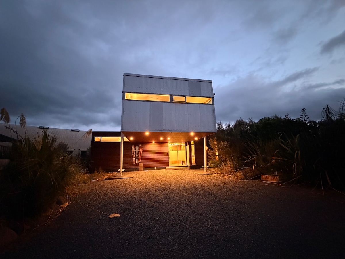 This container home is set in a private spot surrounded by native bush with a view of the mountain through the trees. The interior of the cabin consists of a separate bedroom with a queen size bed, a fully equipped kitchen, lounge and wood burner. The container has a cosy ambience with lots of light on a sunlit day. Large ranchsliders connect you to the natural world outside for hiking, kayaking, canoeing, skiing or mountain exploring. Walk across the road to dine or relax and cook at home.