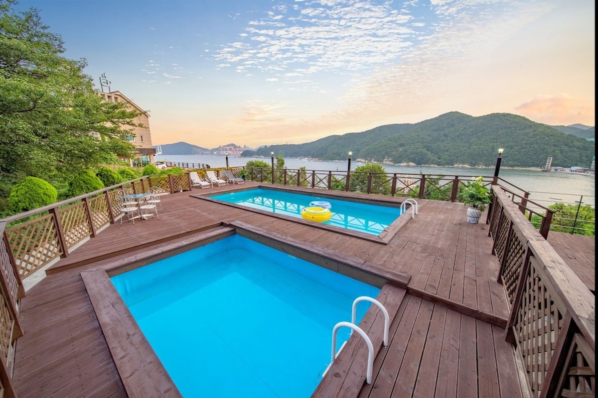 멀리 바다와 섬이 보이고 집 뒤에는 소나무 숲이 있는 산이 있습니다. 아기자기한 정원과 깔끔한 거실, 옥상에는 달과 별, 산을 보며 온욕을 즐길수 있는 소박한 히노끼욕조가 있는 예쁜 전원주택 으로 이곳에 머무는것 자체가 힐링입니다 THE BADA..사랑하는 사람과 조용히 쉬었다 가시기엔 최적의 장소입니다. ■ 캡슐커피(1인1잔)가 웰컴드링크로 제공됩니다 ■ 바베큐는 그릴, 석쇠(철망), 집게, 토치,장갑 등이 무료로 세팅되어 있으니 숯만 사오시면 됩니다. ■ 넷플릭스 계정이 연결되어 있어 시청 가능합니다 죽림 신도시(시외버스터미널, E-마트 소재)와 승용차로 10여분 거리입니다. 주요관광지(중앙시장,동피랑,루지,케이블카) 25~30분 소요됩니다.