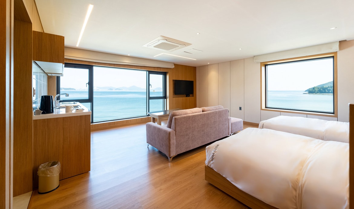 거제 바람의 언덕 도보 5분 거리 위치 도장포 외도 선착장, 신선대를 걸어서 갈 수 있으며, 객실에서 신선대 조망 가능 * 기준인원 2명 ---- 추가 선택항목 (현장 결제) ------ * 인원 추가비용 : 1만원 / 인당 * 애견 추가 비용 : 마리당 2만원(15Kg미만 입장가능) * 2인 몽돌 바베큐세트 + 조식(5만원)