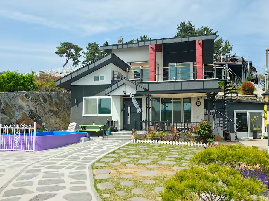 남해 중심에있는 위치하여 있으며 관광지 접근성이 매우 좋으며 집한채만 있는 완전한 독채펜션이라 보다 프라이빗하며 바다뷰와 저녁 밤하늘이 매우 아름다운 조용한 시골마을의 아름다운 펜션입니다 완전독채의 복층 구조로 되어 있어 대가족들 모임과 지인모임에 매우 적합합니다 테라스가 있어 바베큐(무료)가능하며 불멍을 할수도 있어 캠핑의 느낌도 있고 야외 어닝이있어 비오는 날 운치를 더합니다 침실 퀸침대 1개, 슈퍼싱글침대4개, 푹신한 매트가 2개로 넉넉하고 깨끗한 침구가 구비되어있습니다. 주방 대가족이 쓸수 있는 식기및 수저, 냄비, 후라이팬, 전기압력밥솥(10인용),각종양념,8인용식탁외좌탁, 자이글, 인덕션,전자렌지,냉장고,전기포트,원두커피,그라인더, 커피메이커,제빙기(여름) 욕실 넓은욕조와 넉넉한수건,칫솔,치약,비누,바디워시,바디워시타올,샴푸,헤어드라이기,고대기,머리빗 자전거 빔프로젝터,닌텐도게임기,어린이책,베드민턴 , 야구글러브 루미큐브 윶 젠가 등