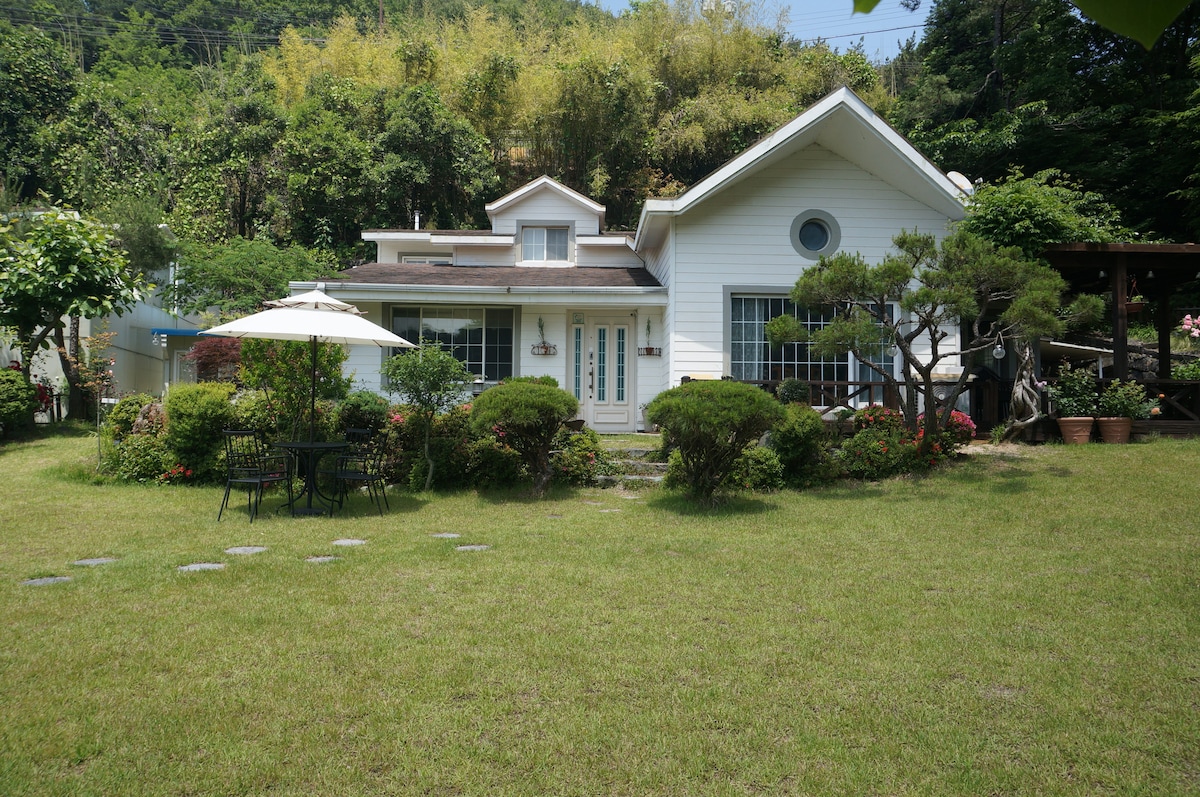 거제담음은 거제시 수월동의 낮은 산들로 둘러싸인 한적한 전원주택 마을에 있습니다. 그림에나 나올 것 같은 예쁜 집들과 산에서 내려오는 개울의 아름답고 평화로운 풍경을 가지고 있습니다. 정원에는 여러명이 함께 식사할 수 있는 야외테이블과 대형 무쇠솥뚜껑이 있어 맛있는 바베큐를 즐기실 수 있습니다. 또한 넓은 텃밭에서 건강한 무농약의 채소들을 뜯어 먹는 즐거움도 느끼실 수 있습니다. 밤에는 맑은 개울소리와 함께 캠핑 화로의 불멍을 즐기실 수 있습니다. 아침에는 조식이 제공되니 좀 더 편안한 여행이 되실 것입니다. ( 평일과 주말할인요금 숙박시에는 제공되지 않습니다) 전원주택에서 새소리와 개울소리, 맑은 공기와 초록내음을 충분히 느끼며, 내 집 같은 편안함과 따뜻함 그리고 온전한 휴식을 누리십시오.