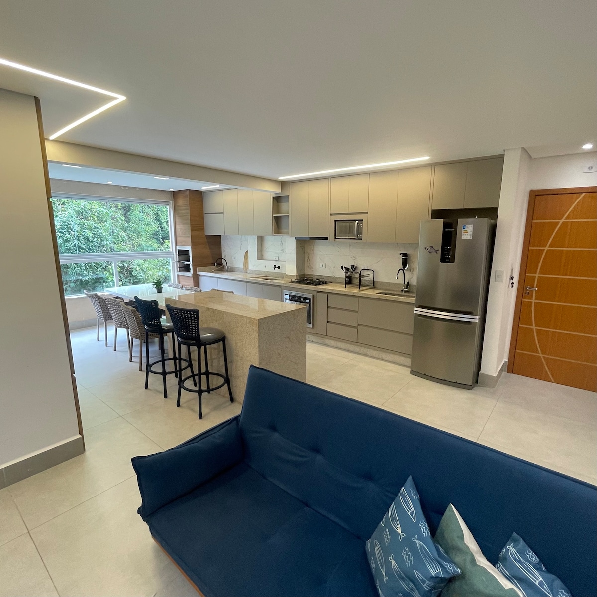 Apartamento novo/reformado, com vista incrível para o mar na melhor localização de Ubatuba. Perto de tudo e ao mesmo tempo em meio a natureza. 1 quarto com cama de casal e vista para o mar Sala integrada com a cozinha Piscina no condomínio. Ar condicionado Wi-fi rápido de 200mb Vaga de garagem Portaria 24h Fica na Prainha do Matarazzo e a 5 minutos da Praia do Perequê-Açu. Moderno e com uma vista paradisíaca. Por estarmos próximos ao Café de La Musique, pode ter barulho nos finais de semana.