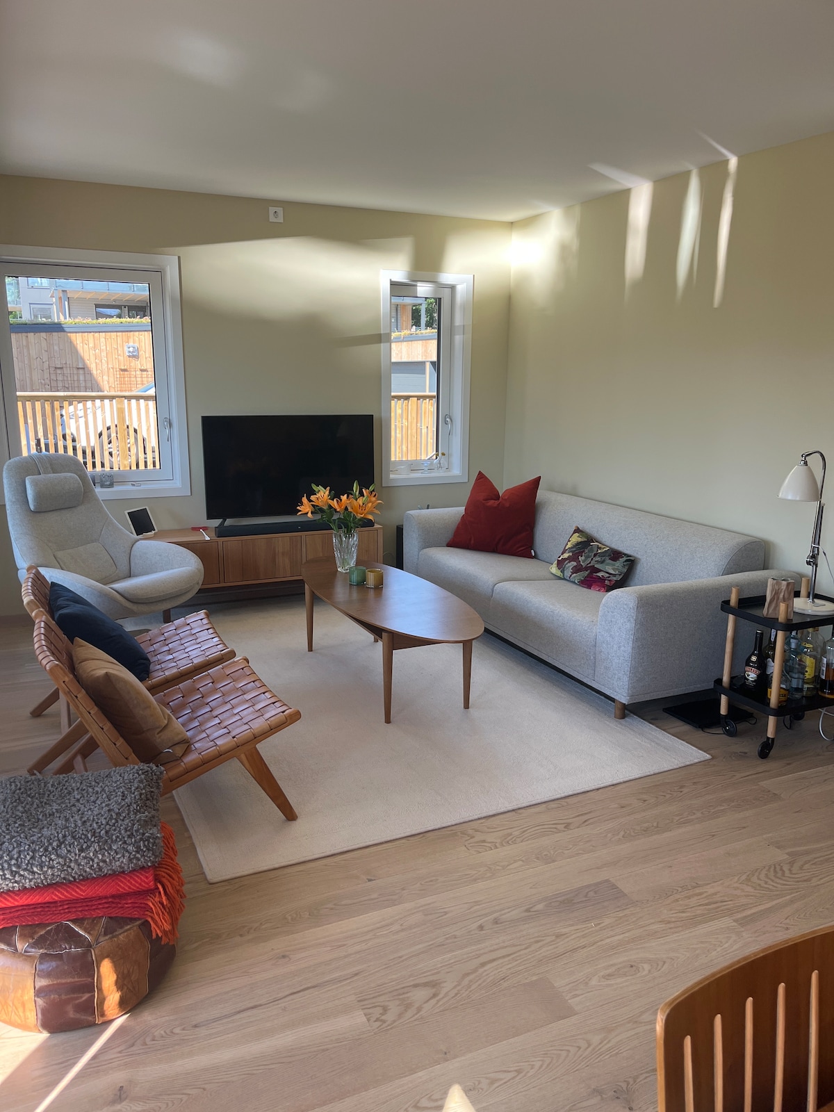 Stylish apartment with patio centrally located within walking distance of Brygga in Tønsberg. Quiet area, outdoor parking on the property. Access to the entire apartment and one bedroom. Double bed in the bedroom in addition to the possibility of two extra guest beds. Includes: kitchenware and crockery, fridge, freezer, iron, ironing board, washing machine and drying rack, outdoor furniture, bed linen, towels, soap, shampoo, conditioner++. You only need to pack toiletries and your own clothes.