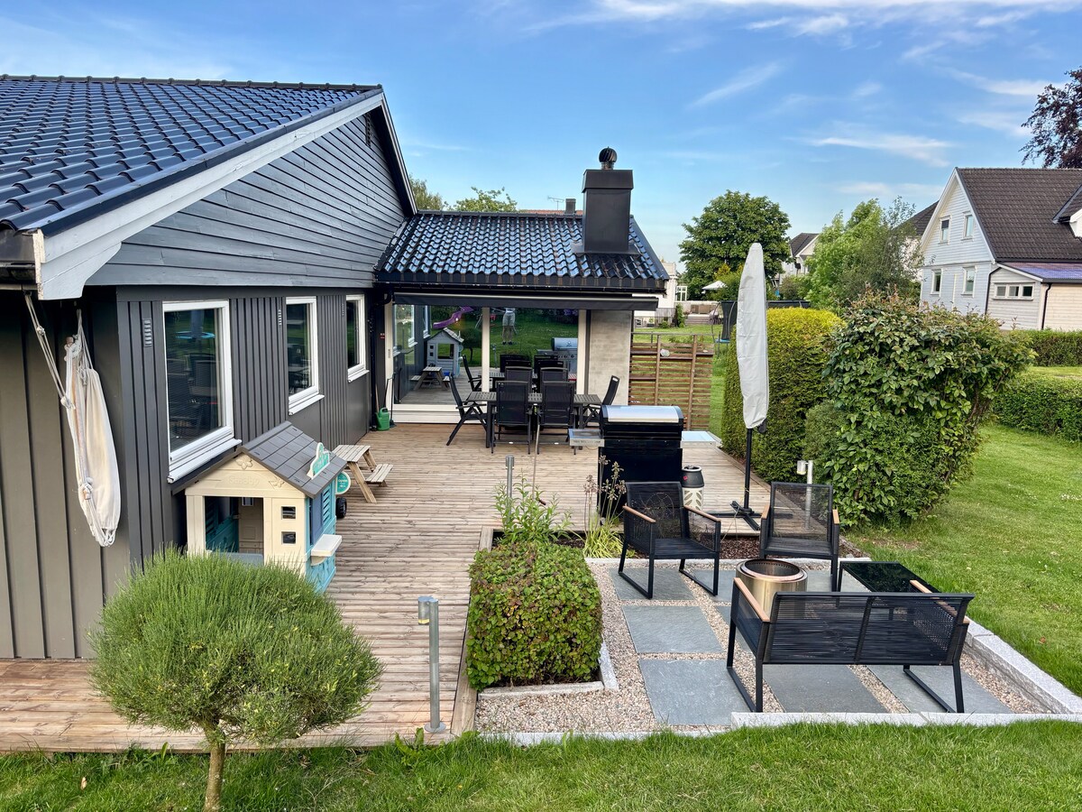 Charming modern house with private sauna and garden with barbecue area and seasonal vegetables. 20 min from Sandefjord Airport Torp and Tønsberg. Forest right outside the door with walking distance to bathing water. Snowshoe mats and four bicycles. Perfect for families of up to 5 people (king s bed, 2 sleeping places on the loft in the living room, 1 bed in the living room). Games, chair, bed and toys. Sauna, bed linen, basic goods and towels are included. Good discounts for long-term rentals.