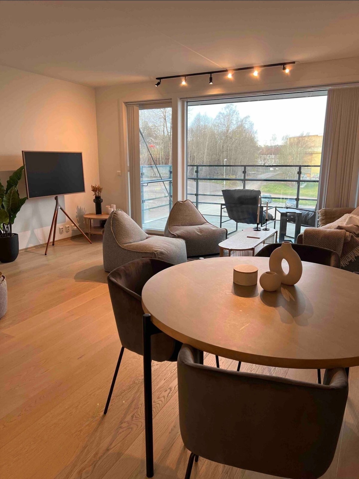 Max 7 voksne (3 doble+1 enkel seng. Ungdom/ barn med voksne . Leil. med stor stue med gulvv., AC., radio, tv, lite kjøkken, kjøkkenbord i eget rom, 3 soverom med doble senger a 150cm x200cm l. +1 skrivebord, bad m. gulvvarme, jacuzzi/ bobleb. serv.seksj., v.rom med vaskemaskin, tørketromel, tørkestativ. inne/ute , dusjkab. , tilgang til garderobeskap i eget rom, egen inngang. Flisgulv, bortsett fra stuen og soverom som har 1 stavs parkett. 1 reiseseng barn, med madrass, dyne og pute.