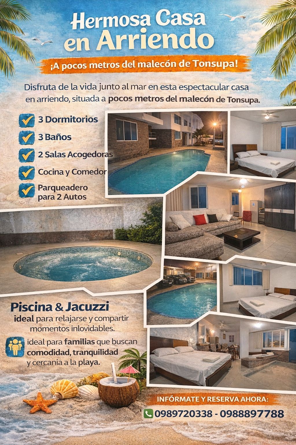 Se arrienda casa en Tonsupa - en el Club del Pacífico, una cuadra atrás del Diamond Beach☀️ (Precio por la casa) Max 10 personas 4 dormitorios Distribución: 🏝️ dos cuartos camas matrimoniales, todos con sábanas 🏝️dos cuartos literas (cama de abajo de 2 plazas 🏝️3 baños completos, agua caliente 🏝️Sala, comedor, cocina 🏝️ 2 parqueaderos 🏝️ piscina, hidromasajes, cancha 🏡conjunto privado de 10 casas A una cuadra del Dimond Beach Es casa adosada amplia de 3 pisos más terraza.