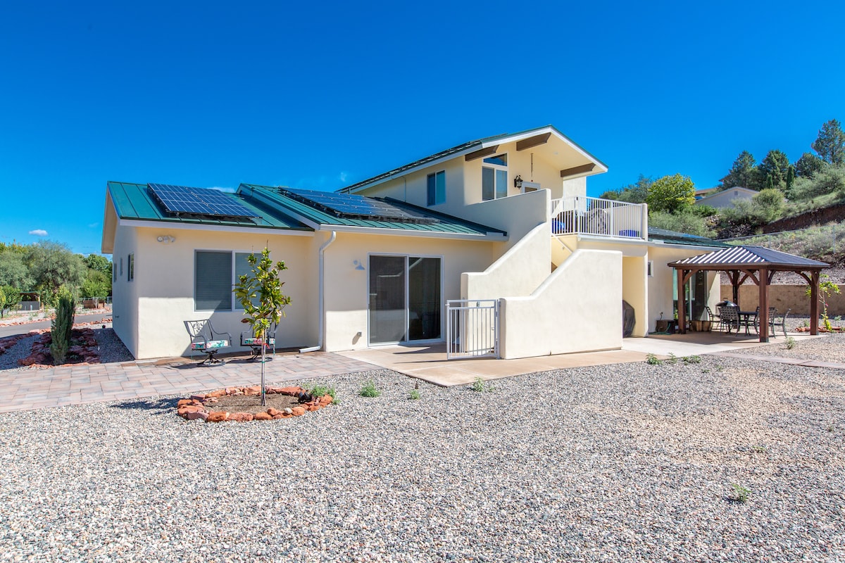 Mountain home outside the Phoenix area with cooler summer weather. Located in a small town near local bars, restaurants, and shops. Two bedrooms, one bathroom, upstairs loft, large covered patio with propane grill, full kitchen, and a big dining table for meals or games. Features a 75 inch TV with YouTube TV, fast WiFi, 5G cellular service, a workspace with monitor, and plenty of parking.