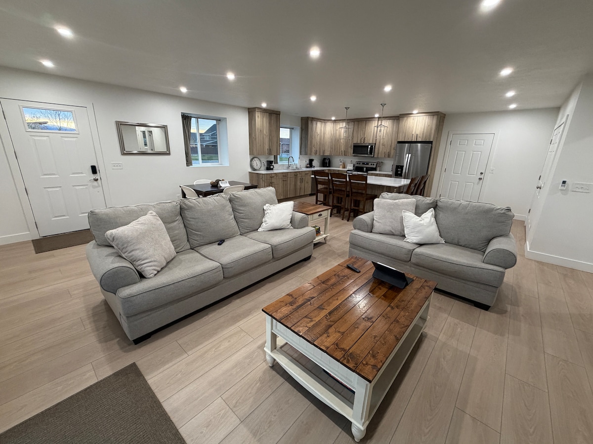 Luxurious downstairs retreat in a newly built home in Stansbury Park dark sky community. Spacious and bright with large windows, elegant finishes, and themed decor in each room. Relax with high-end Egyptian cotton bedding, a 65” 4K TV, washer/dryer, and gigabit fiber internet. Stargaze with a telescope or unwind by the fire pit. Just minutes from Tooele Motorsports Park, this modern haven is perfect for couples or small groups seeking comfort and starry nights under Utah’s clear skies.