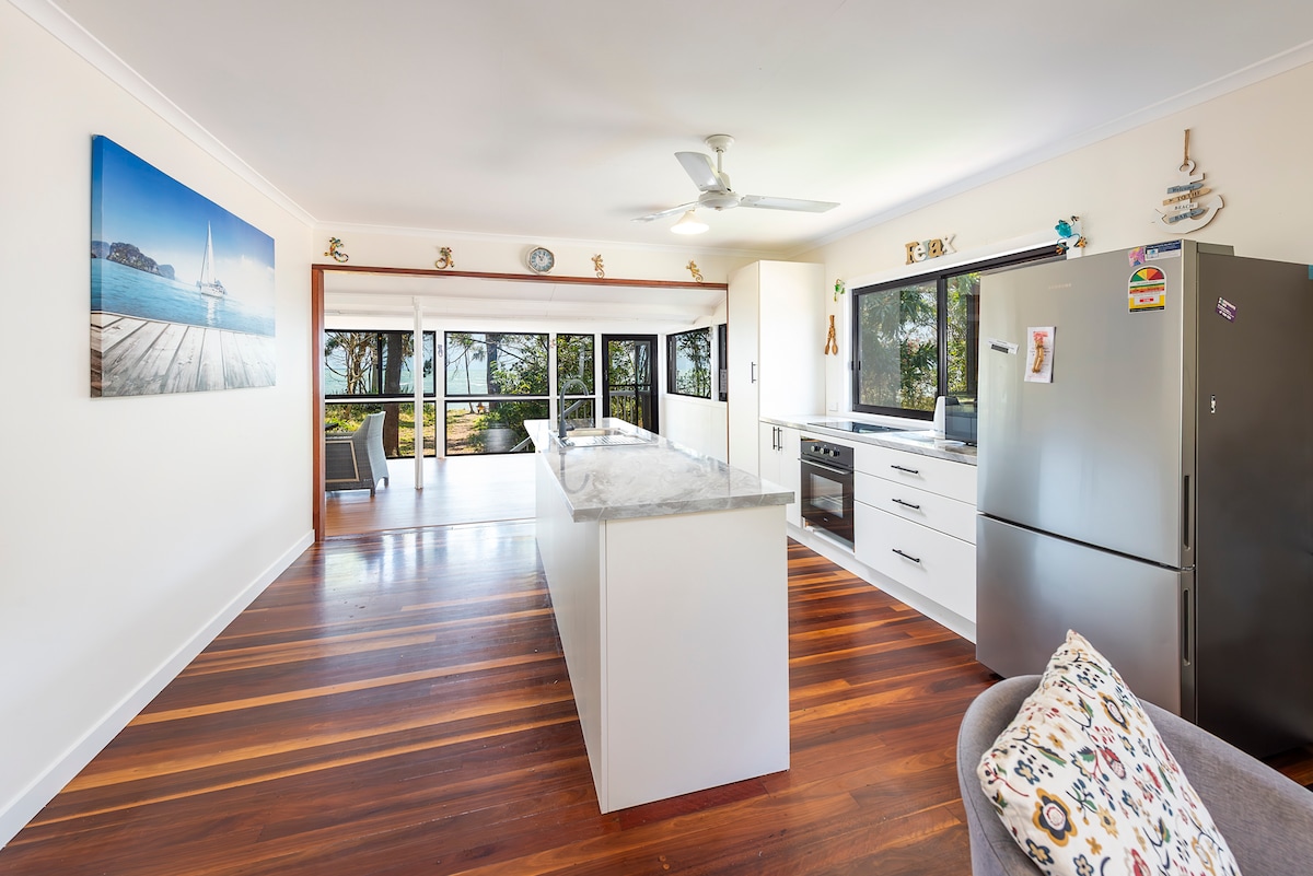 THE DECK ON KINGFISHER is metres from an unspoilt dog friendly beach. Toogoom is a tranquil seaside village just 15mins to Hervey Bay. Ideal for getting away to enjoy fishing, boating or long walks. A short stroll along the beach for coffee or delicious eats! THE DECK is the perfect escape for couples and families. Open plan with a large deck for outdoor entertaining. All rooms are air conditioned. Fully fenced for privacy and safety with lockup garage and undercover parking for boat.