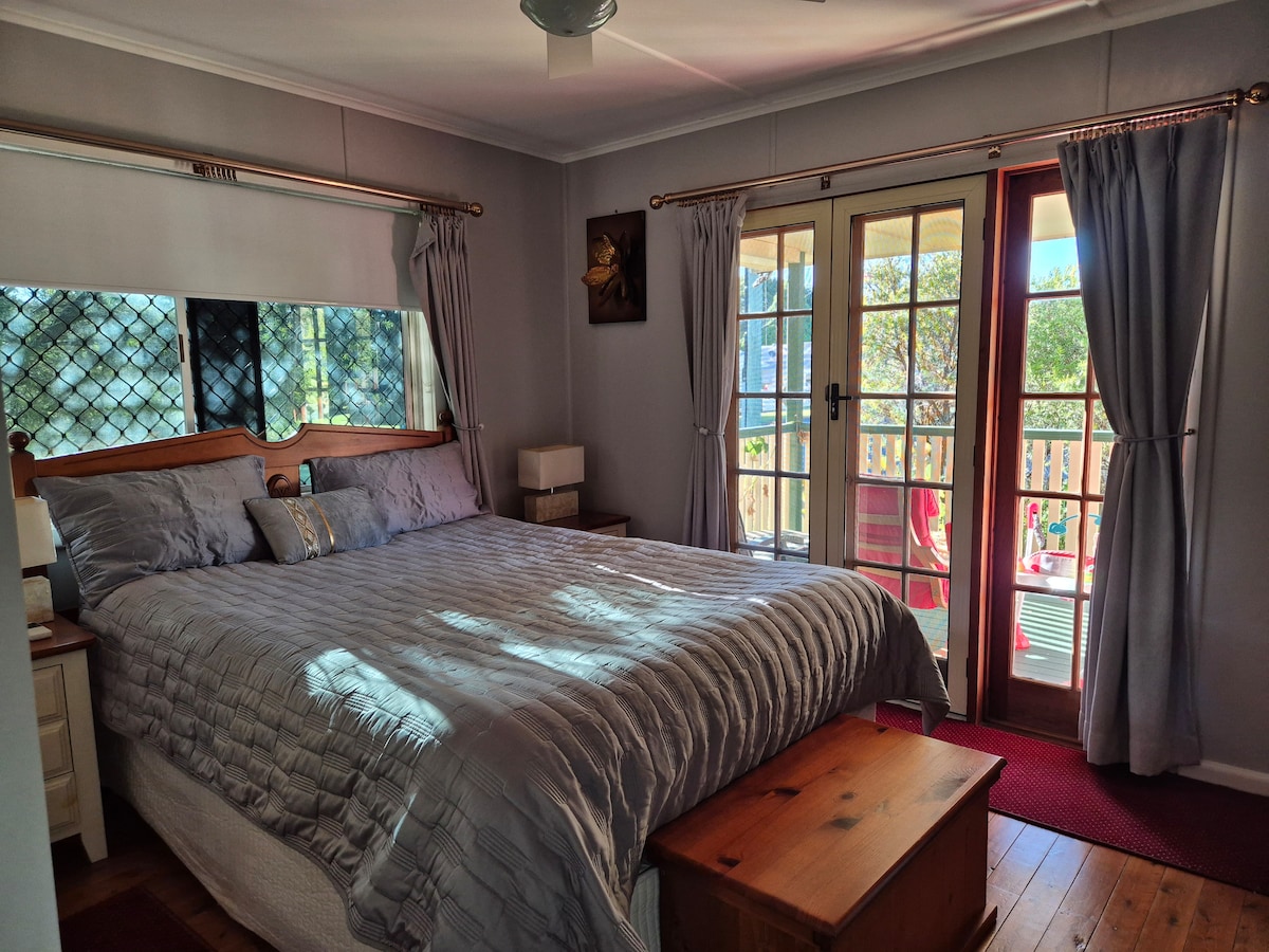 Walk to Queens Park, CBD, cafes, shops, Cobb and Co museum - all less than 2kms. With views to the west and located on a rise on the north/eastern side of town, this quaint home has all you need. Relax on the intimate front verandah and listen to the birds, or prepare a meal and relax on the back deck and watch the sunset over Toowoomba. The Space The cottage has been fully renovated to an above average standard. The bedroom is master with own ensuite and walk in robe to store your luggage.