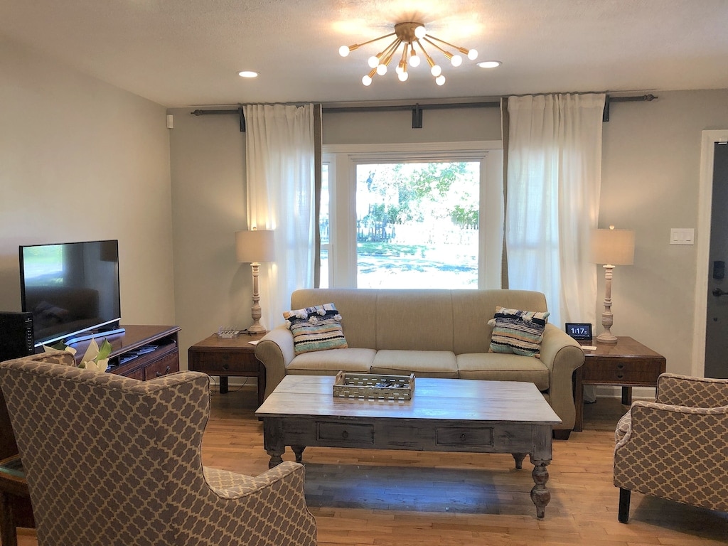 THIS house is exactly why you LOVE AirBnb. This fully remodeled ranch home has four bedrooms, THREE full bathrooms, two of which are en-suite with LARGE bedrooms, and the entire house is less than 20 years old. Each room has a smart TV with SIX total! Cook a meal in our OPEN KITCHEN on QUARTZ countertops without missing any of the conversation. Bring your fur baby to enjoy the fenced in backyard and bring EVERYONE to enjoy the two living spaces and over 2000 finished square feet of this home.