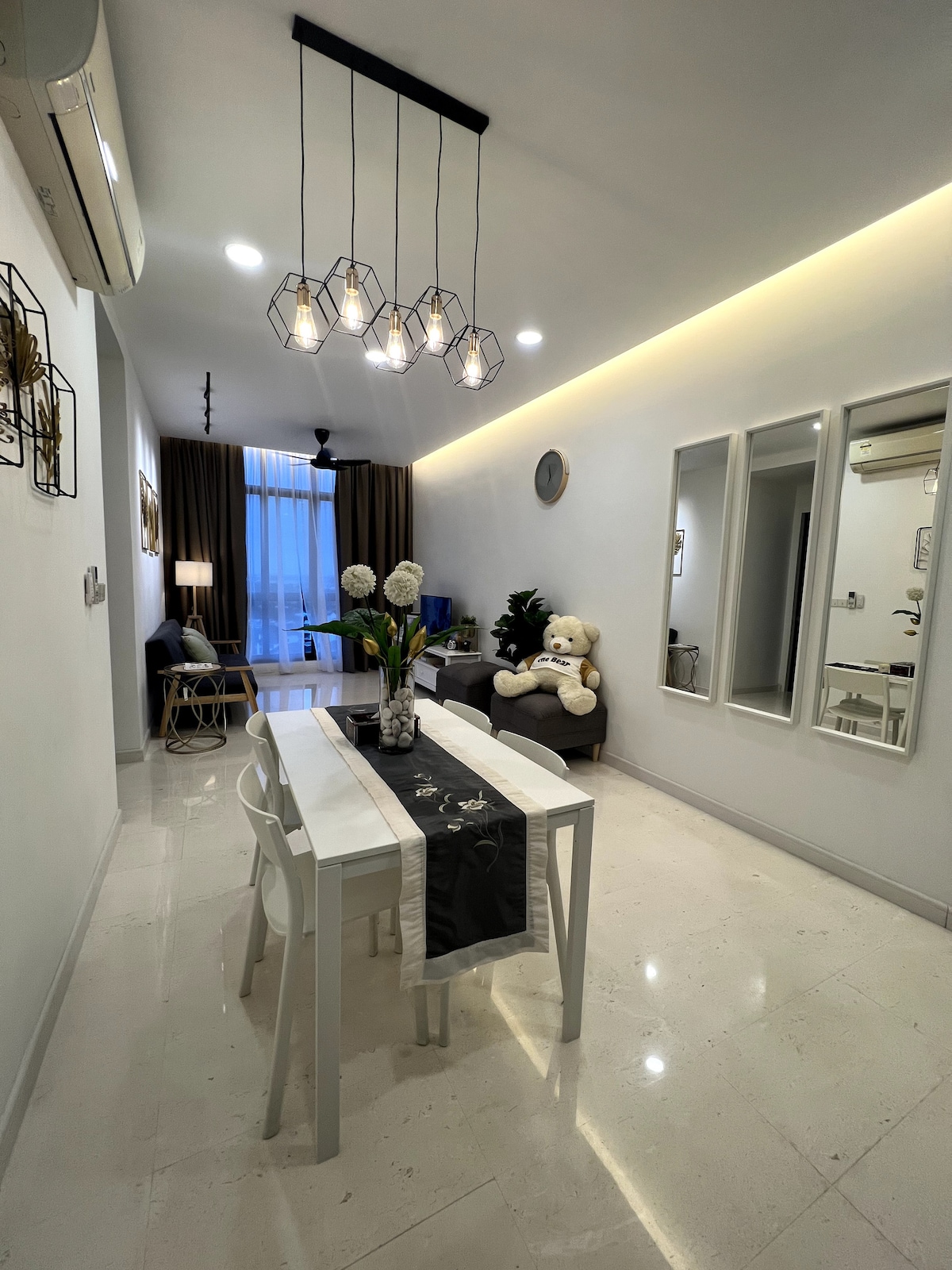 Our unit designed with white & black concept, nearby Toppen Ikea, Aeon Tebrau, Mount Austin trendy cafes and Johor Jaya Street food vendors and restaurants . We provide: *500Mbps high-speed WiFi *fully air-conditioned (5 units aircon) *karaoke & TV box system (Jazpiper) *65inch smart TV *mahjong set & table *board games *simple kitchenware *SK Magic water purifier *towels *shampoo *body wash *coffee & tea