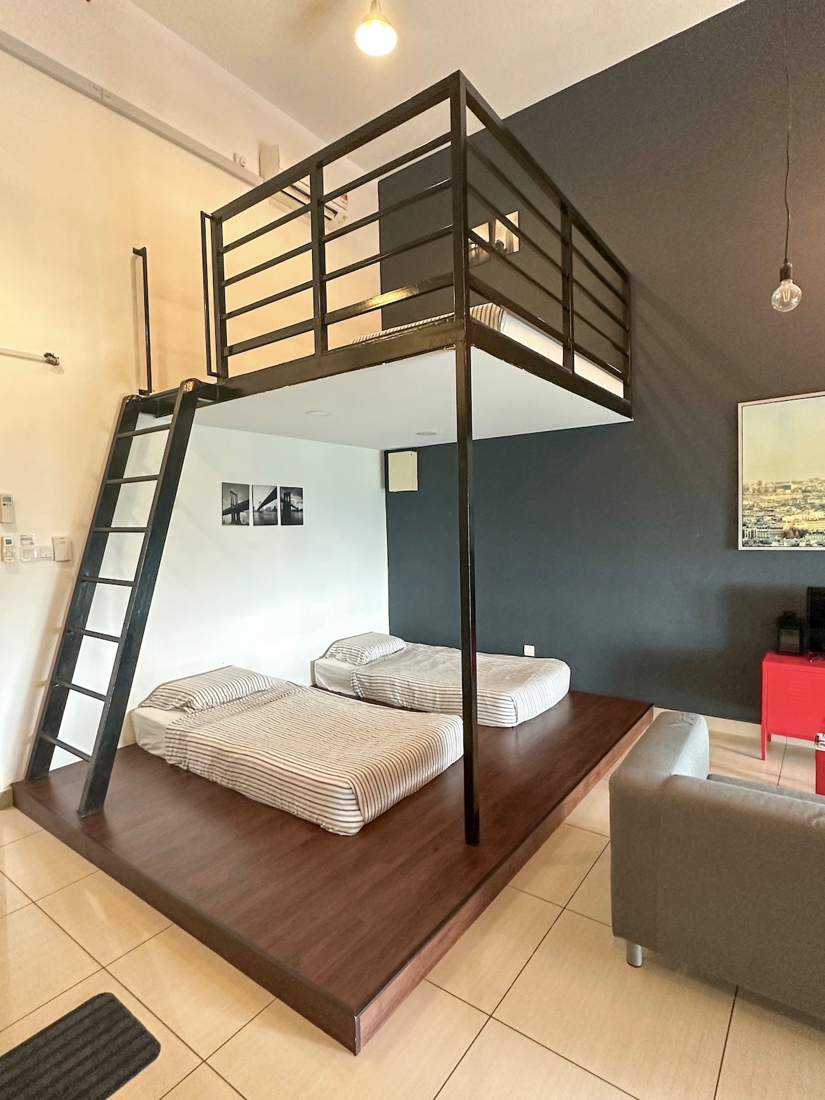 The Loft Style Room by Cactus Homestay Chic and cozy designed — The Loft Style Room blends modern industrial vibes with warm. Featuring a stylish lofted sleeping space, exposed brick walls, vintage decor, it’s perfect for a laid-back stay with friends or loved ones. 📍 Located at Manhattan Sovo, Taman Mount Austin — right in the heart of cafés, shops, and city convenience, all wrapped in a calm, curated interior. 🛋️ Where modern design meets comfort, and space is reimagined with flair.