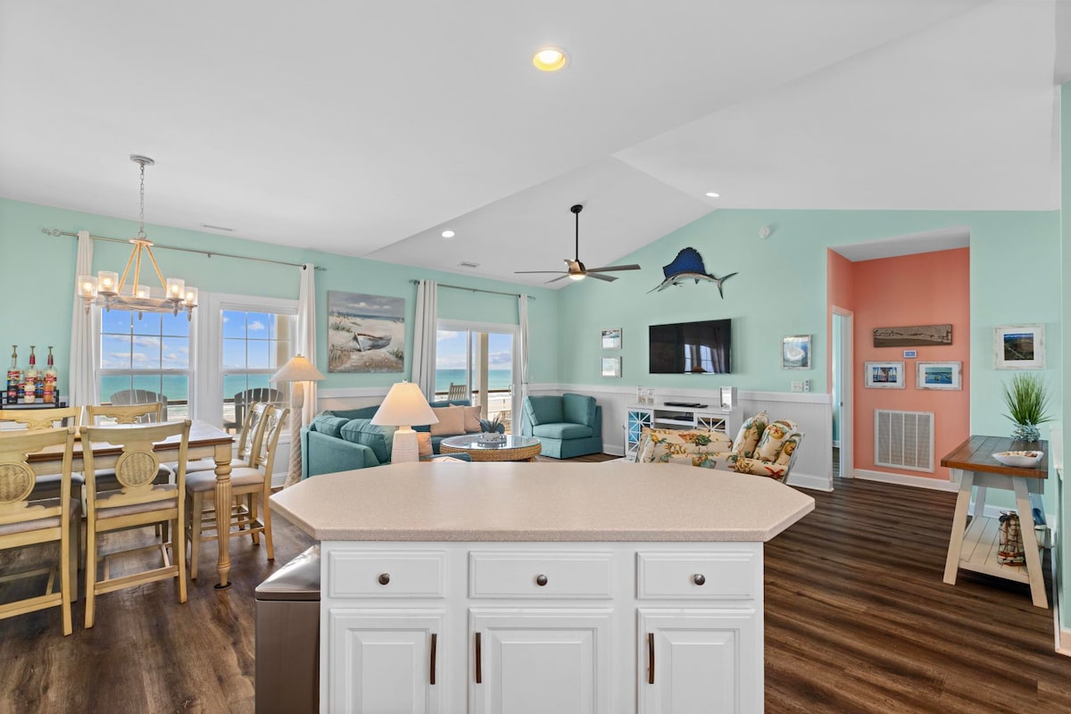 Linens and household supplies provided. Dogs OK. Welcome to The Ocean Breeze, a beautifully renovated oceanfront 3 bedroom, 3.5 bathroom townhouse with breathtaking, unobstructed Atlantic views. Fall asleep to the sound of waves and wake to stunning sunrises. Enjoy three private balconies with comfortable outdoor seating, perfect for relaxing with family and friends while taking in the ocean breeze. Keep an eye out—dolphins are often spotted just offshore, making every stay unforgettable.