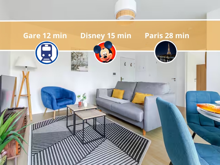 Magnifique appartement proche de Disneyland, de Paris, du centre commercial Val d’Europe et de La Vallée Village. En couple ou en famille, il est temps de vous accorder quelques jours de dépaysement au sein de notre appartement lumineux, calme et reposant. Vous trouverez au sein de notre charmant appartement de 50m2 tous les équipements nécessaires pour vous sentir comme chez vous ! Emplacement stratégique : - Disneyland à 6 min par train RER A ; - Paris en 25 min par train RER A ; -...