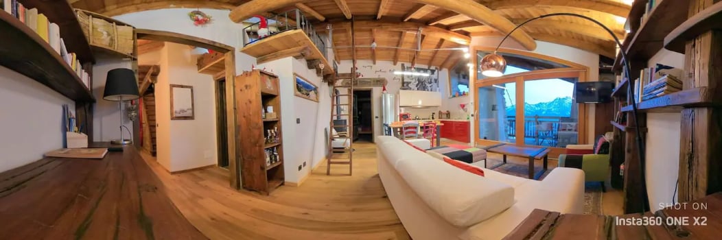 Alps Mountains. Italy. Aosta Valley. A cabin in a small village at 1600 meters,in the peace of meadows, grazing cows and mountains. Snow (usually) in the winter. A place of the heart, lovingly restored preserving the ancient beams of the roof. A wonderful view from the large windows and a special tranquility for those in search of peace, warmth and relaxation. The furniture is very nice: wood above all, but also more lively colors, and modern comforts. Quiet excursions, both on snowshoes or ski.