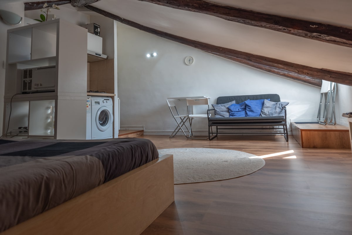 Recently renovated attic apartment, organised into a spacious studio with kitchen area and large bathroom with shower. Double bed and sofa bed in one room. Also suitable for a couple with child, but NOT for 3 persons. The attic is on the fourth floor, with a lift leading up to the third floor; it is then necessary to climb a final flight of stairs to access it. The area is very convenient for all services: The Porta Susa railway station and metro are 200 metres away. CIR00127201659