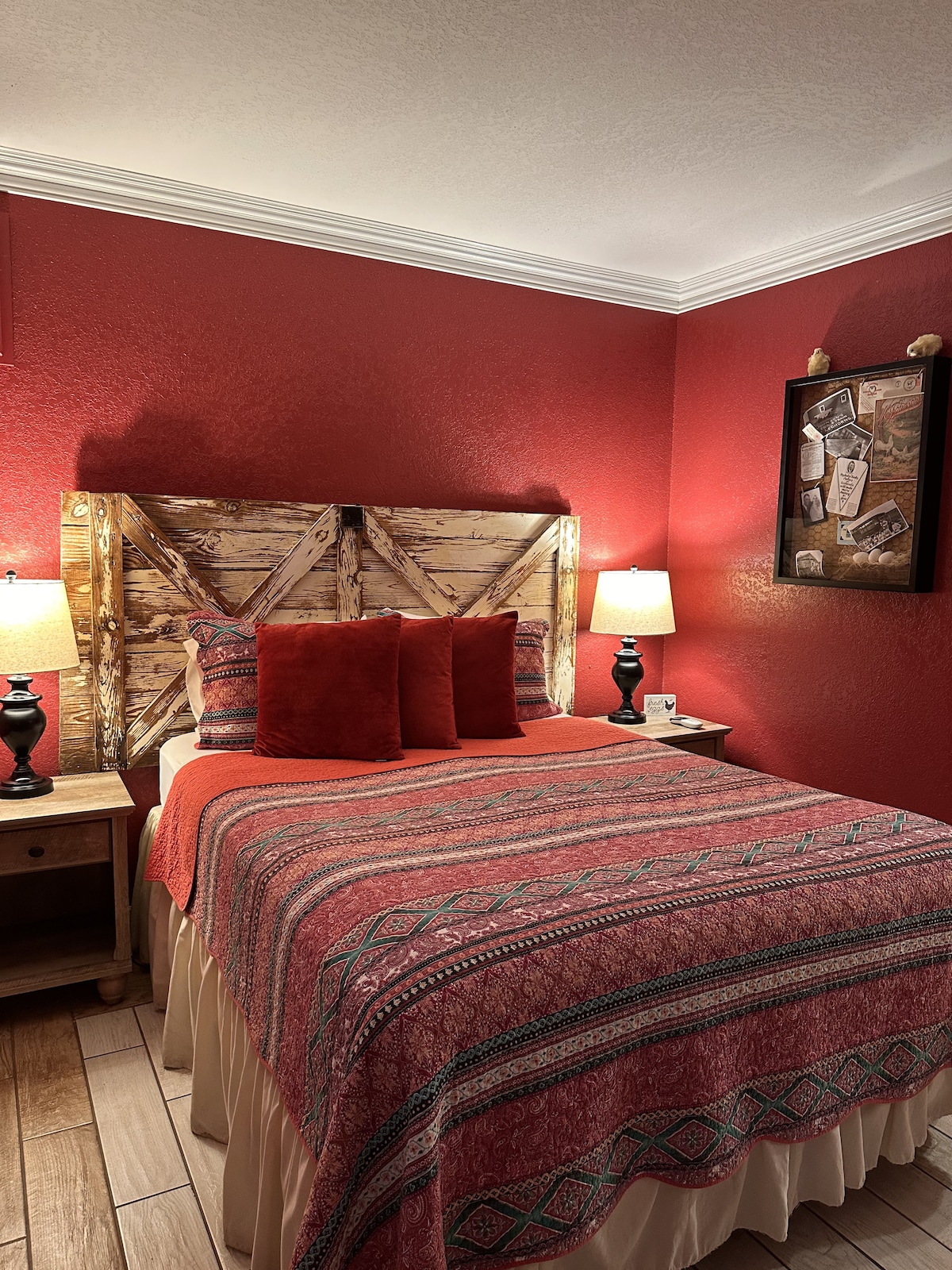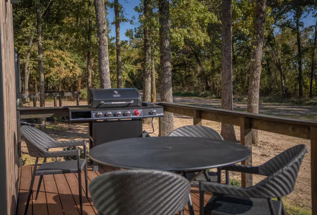 Our rooms sit on 37 wooded acres with 3 ponds. We're just minutes from Marinas on the Oklahoma side of Lake Texoma making us the perfect location for enjoying fishing, boating, and all the other activities Lake Texoma has to offer. Our accommodations feature 6 rustic duplex cabins, with a total of 12 cozy rooms. Each duplex shares a front porch, but the rooms are completely separate inside. Each room contains 2 queen beds, bath, mini-fridge, microwave, coffee maker, smart TV, and free WiFi.