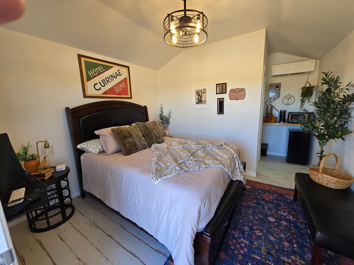 The Olive cabin is inspired by the olive tree, providing a serene and inviting atmosphere enhanced by comfort and timeless beauty of natural tones. You will feel like you have stepped in to a boutique style room in the mediterranean. The queen size bed is dressed in layers of soft neutral-tone for a calm & relaxing stay. You can sit on the covered deck in one of our comfy rockers and see the pool and our fully equipped guest center called The Station.