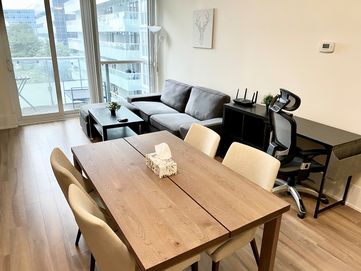 A bright and stylish urban loft in the heart of downtown! This sun-filled suite features soaring 12-ft ceilings, stunning floor-to-ceiling windows, and sleek hardwood floors. Relax on the oversized sofa, dine at the modern table, and cook in the fully stocked kitchen with stainless steel appliances. Sleep soundly on a plush Westin Heavenly queen bed, and refresh in the spa-like marble bathroom. Includes in-suite laundry, high-speed Wi-Fi, and an unbeatable location near vibrant King Street West!