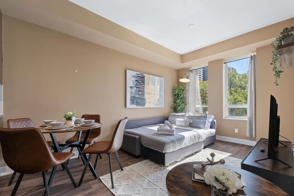 Stay in the heart of downtown Toronto in this modern one-bedroom condo just steps from the CN Tower, Rogers Centre, and the waterfront. The unit features a comfortable queen bed in the bedroom and a sofa bed in the living room, perfect for couples or small groups. Enjoy skyline views through floor-to-ceiling windows or relax on the private balcony. The condo includes a full kitchen, smart TV, high-speed Wi-Fi, and in-suite washer and dryer. Guests also have access to a gym and outdoor pool .