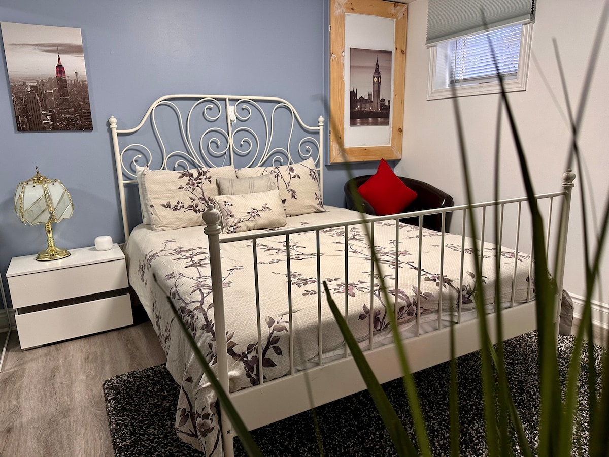 Enjoy your stay in this fully renovated, modern lower-level suite located in the heart of Central Etobicoke. Features: Private entrance Large and bright bedroom with a queen-sized bed and fresh linens, lots of closet space. Bright living area with smart TV, Sleek, fully equipped kitchen with fridge, stove, microwave, coffee maker, and essentials Contemporary bathroom + Powder Room In-suite washer and dryer Free parking and Tesla charger on-site High-speed Wi-Fi. Access to backyard/ BBQ.