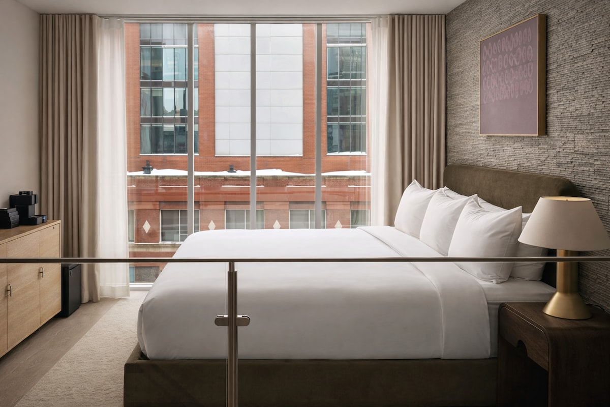 The rooms at Nester Entertainment District are designed for comfort, convenience, and modern city living. Large windows fill each space with natural light, creating bright, welcoming interiors throughout the hotel. Every room includes Roku streaming, a dedicated workspace, and in-unit coffee and tea, making it easy to settle in whether you’re here for a quick getaway or a longer stay. This is our standard queen room, with 1 Queen bed.