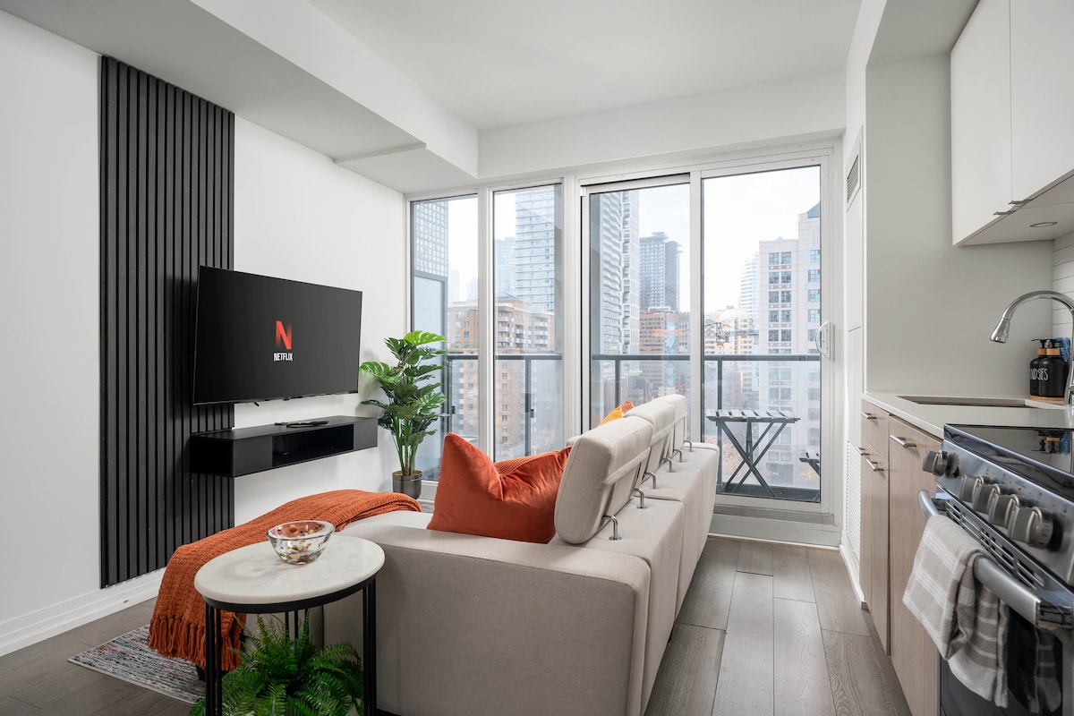 A bright and stylish urban loft in the heart of downtown! This sun-filled suite features soaring 12-ft ceilings, stunning floor-to-ceiling windows, and sleek hardwood floors. Relax on the oversized sofa, dine at the modern table, and cook in the fully stocked kitchen with stainless steel appliances. Sleep soundly on a plush Westin Heavenly queen bed, and refresh in the spa-like marble bathroom. Includes in-suite laundry, high-speed Wi-Fi, and an unbeatable location near vibrant King Street West!